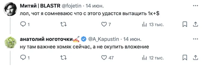 Популярный твиттер-блогер Анатолий Капустин («анатолий ноготочки») заработал на игре Hamster Kombat почти 1500 евро, или около 140 тысяч рублей. При этом листинг «хомяка», которого ждут все юзеры, еще не состоялся.