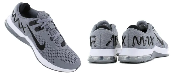 Вторая пара – серые Nike Air Max Alpha Trainer 4. Да, это еще одна модель с воздушным пузырем. И да, здесь он расположен в области пятки. Кроме того, видим верх с сетчатыми панелями, гигантскую надпись Air Max на задней части кроссовка и подошву с отличным сцеплением.