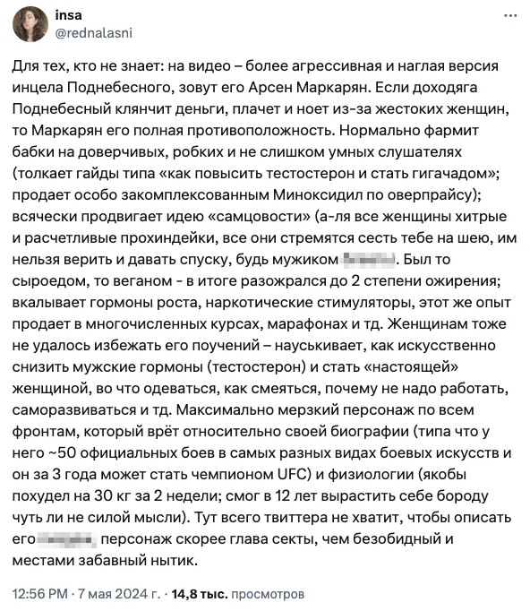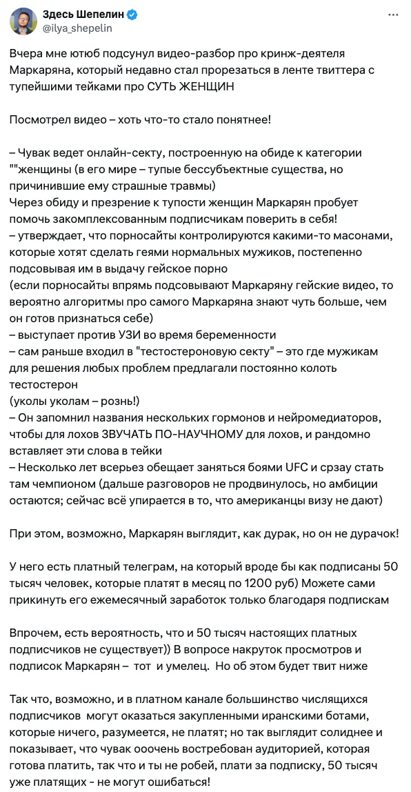 В русском сегменте твиттера начали обсуждать Арсена Маркаряна. Это блогер (Memepedia называет его инфоцыганом), который имеет 7 тысяч подписчиков в X, ведет телеграм-канал на 130 тысяч юзеров и сверкает в соцсетях благодаря ярким высказываниям о женщинах.