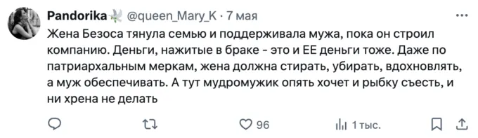 В качестве примера бед, которые могут организовать дамы с амбициями, Арсен привел бывшую жену Джеффа Безоса Маккензи Скотт. Последняя, по его словам, после развода с мультимиллиардером отсудила жирную часть денег Безоса и потратила их на поддержку всяких общественно-политических движений.