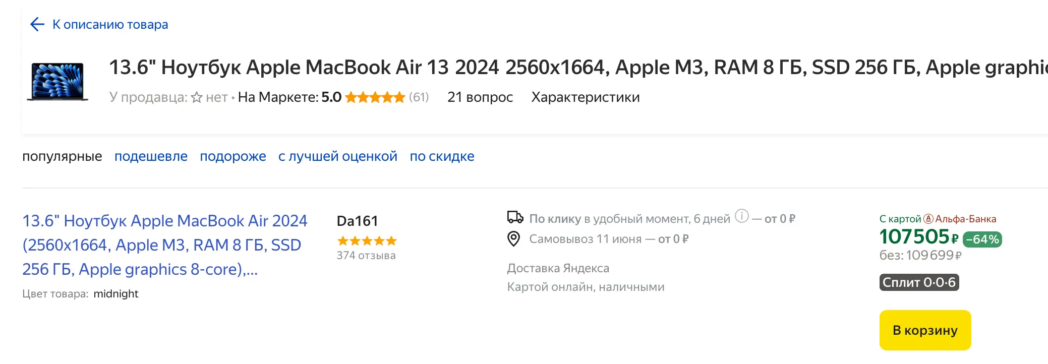 За месяц цены остались примерно на прежнем уровне. Исключением стал прайс на MacBook Air 13 M3, который опустился до 107,5 тысяч рублей. Впрочем, по этому — очень привлекательному — ценнику новый ноутбук пока продают лишь несколько продавцов.