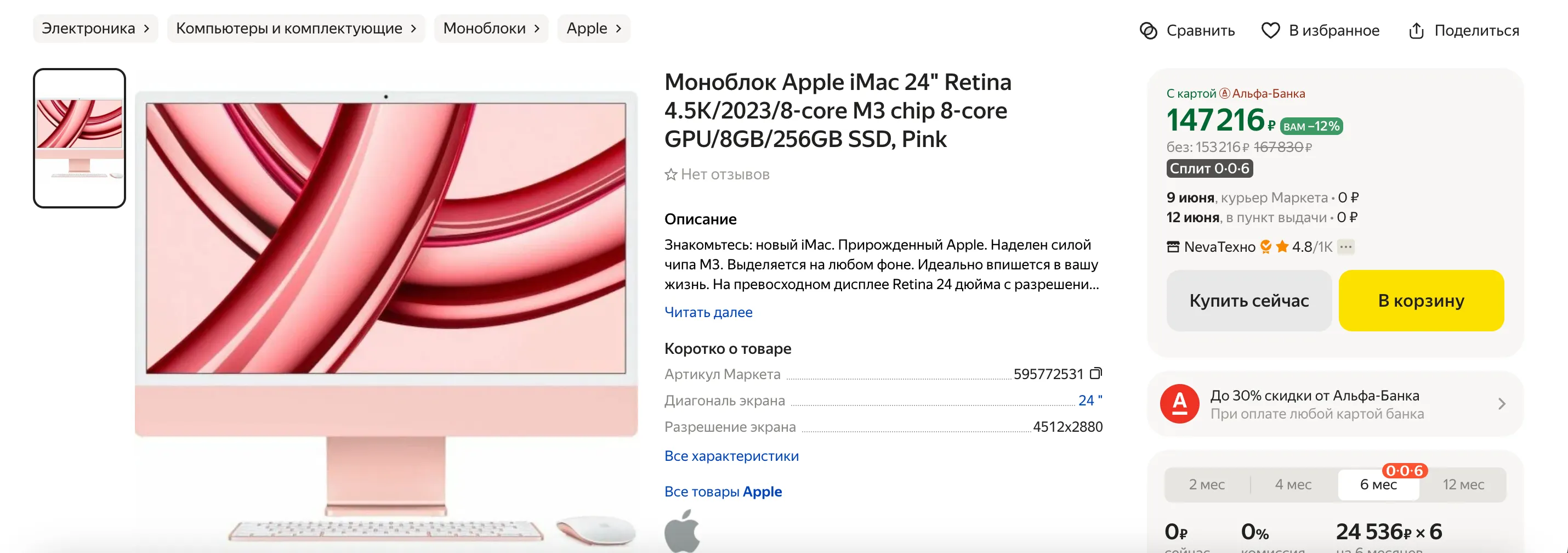- iMac 24 M3 (8/256 Гбайт) — 147 200 рублей. Прошлый месяц — 198 000 рублей