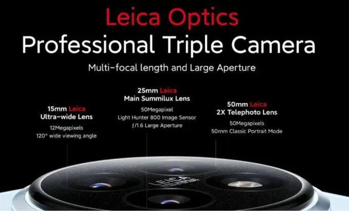 Сзади расположена тройная камера Leica, вписанная в круг. Она получила 50-мегапиксельный широкоугольный объектив, телескопический сенсор на 50 мегапикселей, 12-мегапиксельный ультраширик. Спереди находится двойная фронтальная камера 12+12 мегапикселей.