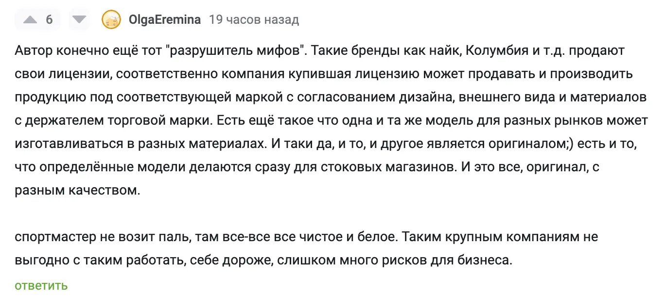 Юзер написал, что «Спортмастер» производит обувь бренда adidas, Nike, New Balance, Puma, Reebok и других известных марок с помощью сингапурской компании Malacca. То есть, по мнению автора, сеть спортивных магазинов закупает обувь у непонятной фирмы, но выдает ее за оригинал.
