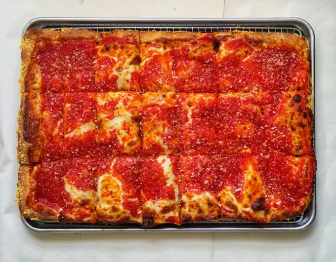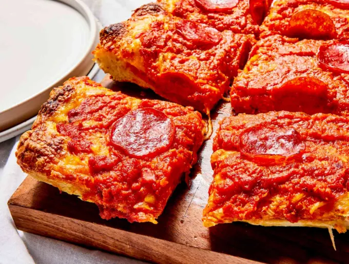 Еще один специфический стиль, который выделяется не столько внешне, сколько методом приготовления. Детройтская пицца многое переняла от чикагской: она часто бывает прямоугольной, бортики могут быть высокими, но главное здесь – порядок, в котором выкладываются ингредиенты.