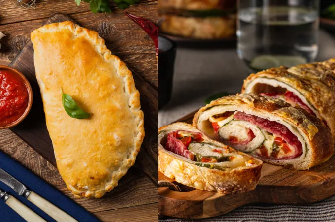 Отдельно поговорим о двух популярнейших видах закрытой пиццы. Кальцоне тут, конечно, на первом месте – вы можете встретить ее в любой пиццерии. По сути, тут все невероятно просто, так что объясним вам принцип и пойдем дальше. Кальцоне – пицца, которую сворачивают вдвое во время готовки. Вот глобально и вся разница.
