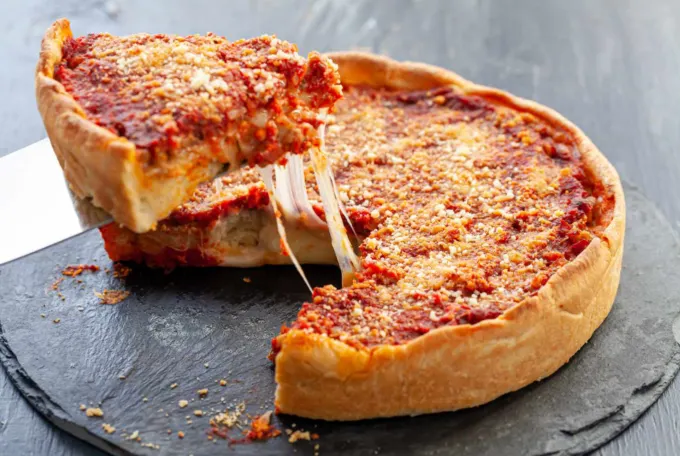 Интересно, что чикагская пицца часто тоже бывает не круглой формы, так что в каком-то смысле она и сицилийская – родственники. Только тут у вас еще и бессовестно гигантские объемы сыра и начинка, которая находится не сверху, а в середине пиццы. Согласитесь, это самый экзотический пункт в нашем списке.