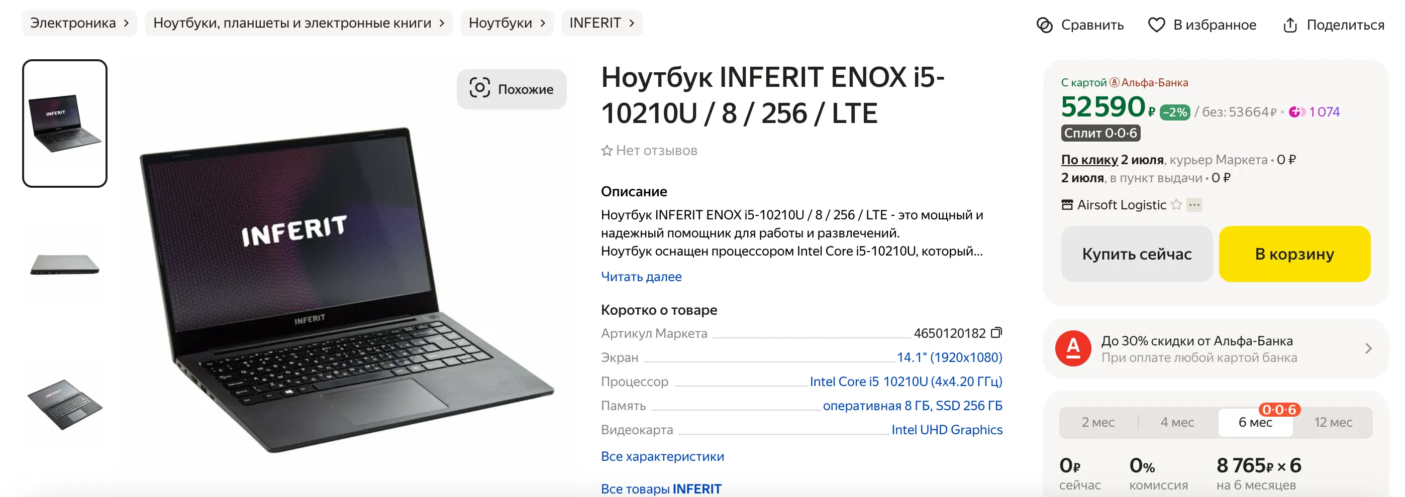 Мы не нашли моделей «Инферит» в свободной продаже, не считая версии Enox. На Маркете этот компьютер отдают за 53 тысячи рублей.
