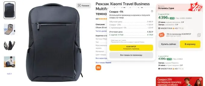 Обычно за Xiaomi Travel Business Multifunctional Backpack 2 просят около 7 косарей, но прямо сейчас на Яндекс Маркете флагманский рюкзак можно забрать всего за 4260 рублей по промокоду KUW1MFZF. А с кэшбеками некоторых банков он обойдётся даже дешевле 4 косарей.