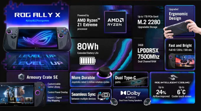 Буста производительности ждать не стоит, так как в основе приставки все так же используется APU Ryzen Z1 Extreme. Однако девайс получил 24 Гбайт оперативной памяти LPDDR5X-7500. Не так важно, что ОЗУ стало больше — главное, что память стала быстрее.