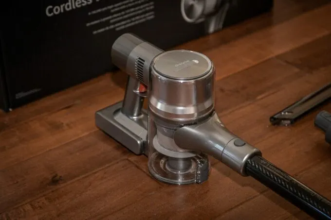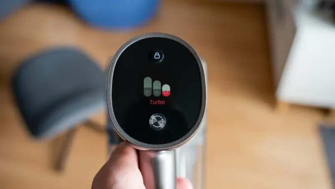 Dreame T30 оборудован солидным двигателем мощностью 190 аэроватт и довольно умной начинкой. Она распознаёт степень загрязнённости и регулирует мощность всасывания в автоматическом режиме. На ручке расположен дисплей, куда вся эта информация выводится, а также кнопки включения и блокировки. Там же можно просмотреть уровень заряда. Производитель заявляет, что батареи хватит на 90 минут работы. Однако по факту всё будет зависеть от используемого режима и уровня грязи в помещении.