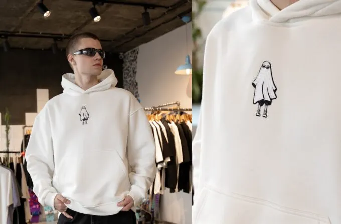 Завершаем мини-подборку айтемом от российского бренда БОРДШОП#1. Это плотное оверсайз-худи из футера: с широким капюшоном и вместительным карманом. На передней части толстовки расположился милый принт – кстати, не просто рисунок, а настоящая вышивка. Получаем достойное стритстайл-худи для тех, кто обожает свободные и светлые вещи.
