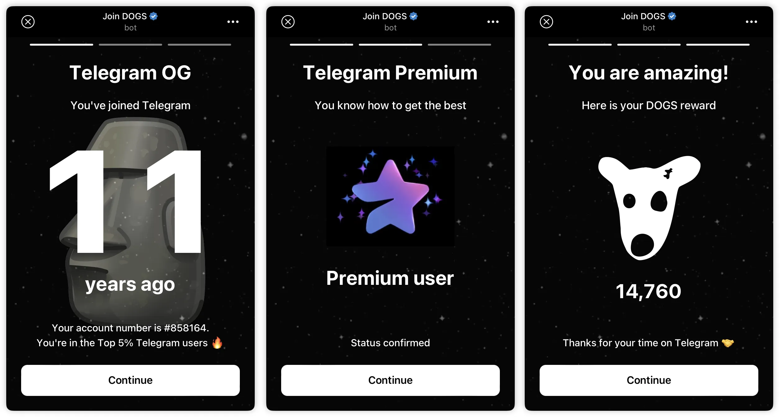Слышали про DOGS (не путать с DOGE)? Это простенькое мини-приложение, которое позволяет узнать, когда вы зарегистрировались в телеграме и заработать немного виртуальных монет. Пока неизвестно, можно ли в будущем обменять их на настоящие деньги, но проект уже привлек к себе гигантское внимание.