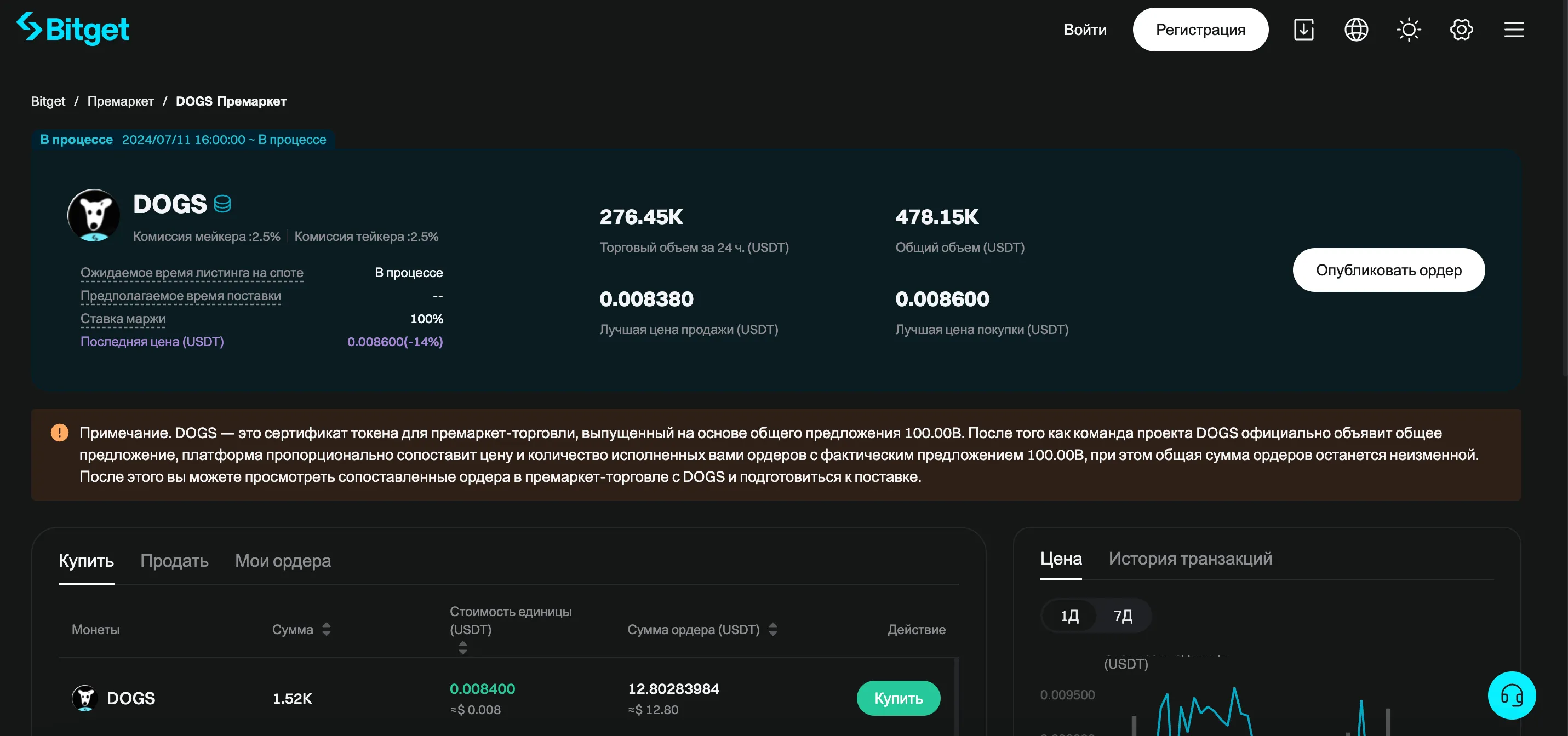 Пока DOGS — всего лишь развлечение на 10 секунд. Но криптовалютная биржа Bitget уже запустила премаркет монеты. Общий объем на предварительных торгах почти приблизился к 500 000 USDT. Кто-то уже купил 992 тысячи токенов DOGS на 18 тысяч долларов — по 0,018 бакса за штуку.