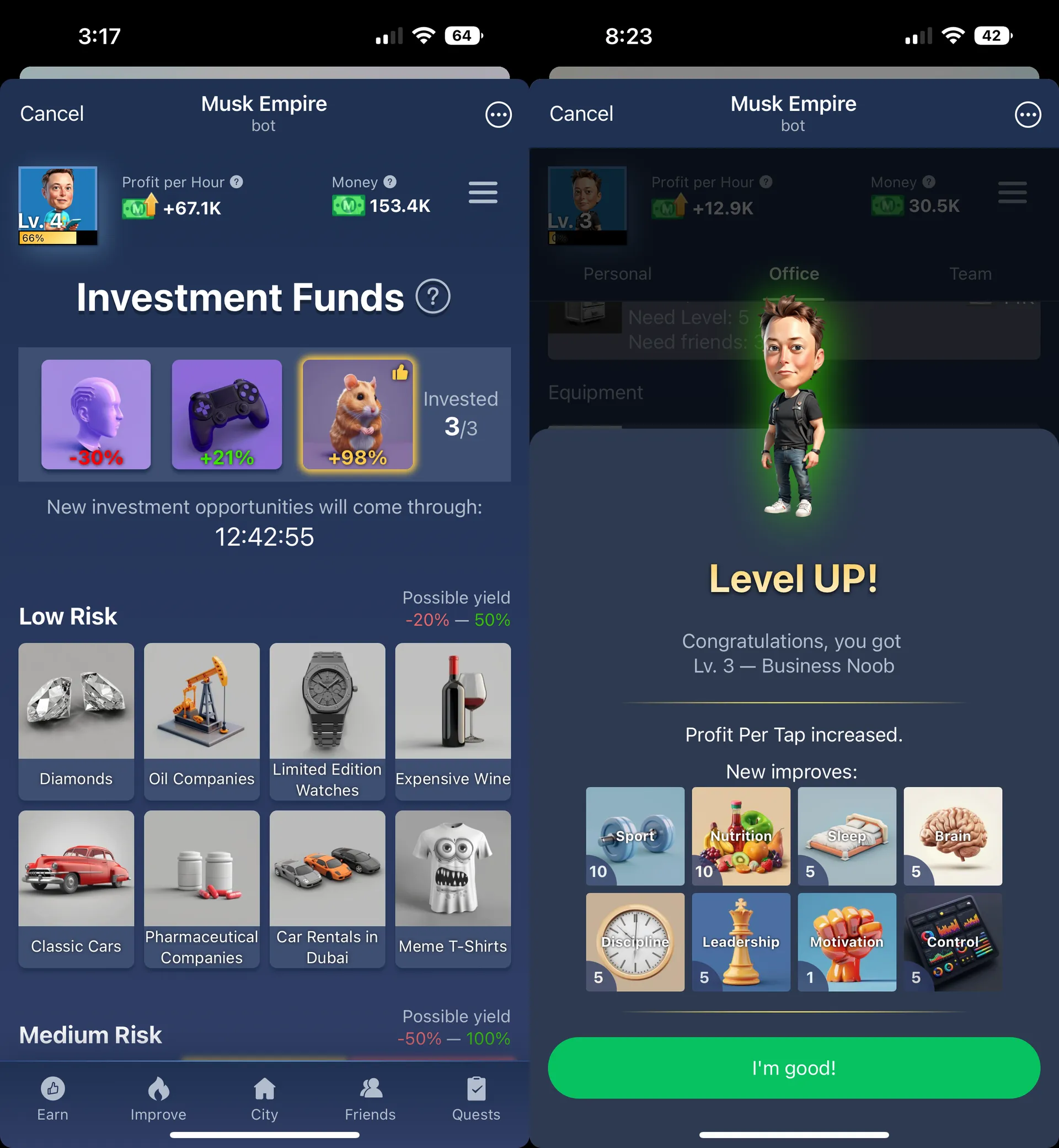 Ради чего это все? Игра, как и другие последние популярные криптопроекты, основана на блокчейне TON: после листинга игрокам должны раздать токены, которые можно будет обменять на биржах. Также создатели Musk Empire подружились с основателями Notcoin: обладатели аккаунта в последней могут рассчитывать на бонусы в игре.