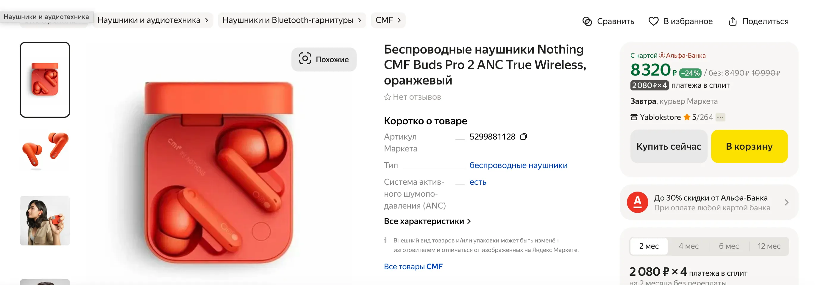 Самые доступные CMF Buds Pro 2 (версия в черном цвете, доставка из-за рубежа) продают за 5,5 тысяч рублей. Аналогичный вариант, но со склада в России, будет стоить 7,5 тысяч рублей (если не хотите ждать 10 дней). А вот каноничная версия в оранжевом цвете пока стоит дорого — 8,3К рублей, но доставка тоже с российского склада.