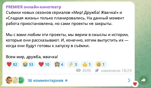 Телеграм-канал VODоворOTT и вовсе поделился инсайдом, связанным с ситуацией. «До нас долетает неутешительная информация от проверенных источников – проекты все же закрыты окончательно, и дело тут не в сценариях, которые уже давно были приняты Premier. Более того, в случае с «Миром! Дружбой! Жвачкой!» все сорвалось в последний момент. Группа во главе с режиссером Иваном Плечевым собиралась в августе заходить в съемки», – сообщили в телеграм-канале.