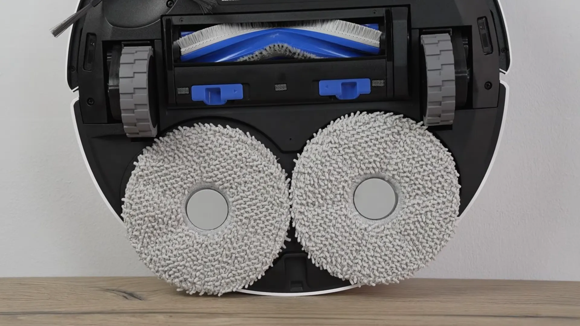 Дизайн пылесоса вполне привычный — круглая шайба с башенкой-лидаром, соплом и щеткой для сбора мусора, а еще двумя выдвижными дисками с салфетками. В комплекте лежит сам робот, станция и сетевой провод. Машина имеет высоту 104 мм от пола, систему датчиков для обнаружения препятствий (спереди и сбоку) и три механические кнопки (запуск, точечная уборка, возврат на базу). Пылесборник робота находится под верхней крышкой, а резервуар для воды размещен внутри – его не видно. Снизу находятся датчики обнаружения высоты и сенсор для обнаружения ковра.