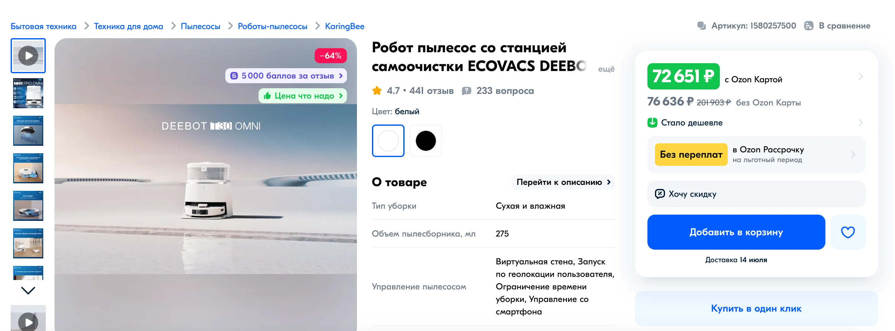 Русскую версию DEEBOT T30 PRO OMNI, которая без проблем работает с российскими сим-картами и не требует подключения к китайским серверам, можно приобрести на Ozon. Здесь робота продают примерно за 90 тысяч рублей. Но с промокодом TPSRS6128E6A устройство можно будет забрать с гигантской скидкой — всего за 72 651 рубль. Чтобы получить максимально доступный ценник, оплатите покупку бесплатной картой Ozon.