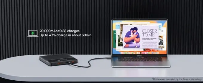 От батареи Baseus Blade можно спокойно зарядить 16-дюймовый MacBook Pro, Steam Deck или сразу несколько смартфонов. Не с 0% до 100%, но пару часов работы гаджета вы точно получите. Сам производитель заявляет, что мелкий MacBook Pro можно зарядить до 88%, причём за 30 минут он наберёт 47%. В самолёте, поезде или автомобиле это реально полезная вещь.