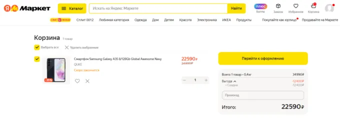 Коротко: Samsung Galaxy A35 отдают на Яндекс.Маркете всего от 22 590 рублей.