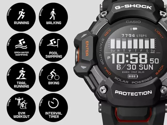 Кроме того, в G-Shock GBD-H2000-1A есть функции шагомера, пульсометра и пульсоксиметра. По точности замеров они не уступают эталонным Garmin. Ещё эти часы могут пофлексить влагозащитой в 20 АТМ. Такой левел позволяет нырять в них даже в океан.