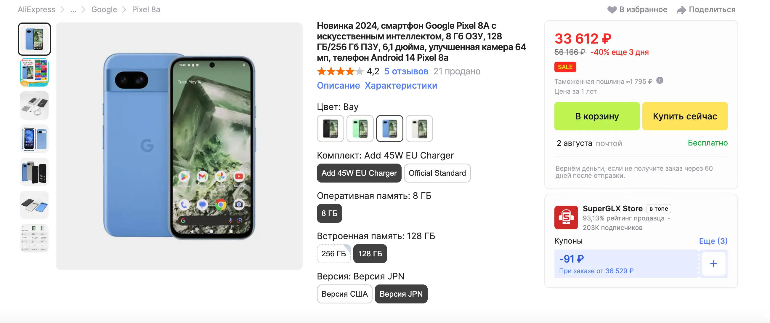 В середине мая он стоил около 60 тысяч рублей. Сейчас на Али японскую версию Google Pixel 8a можно купить за 32 146 рублей, если применить купон продавца. Это скидка для тех, кто умеет ждать — сперва пережили ценник в 60К, а теперь останется дождаться доставки из другой страны и заплатить небольшую пошлину (для всех товаров дороже 200 евро).