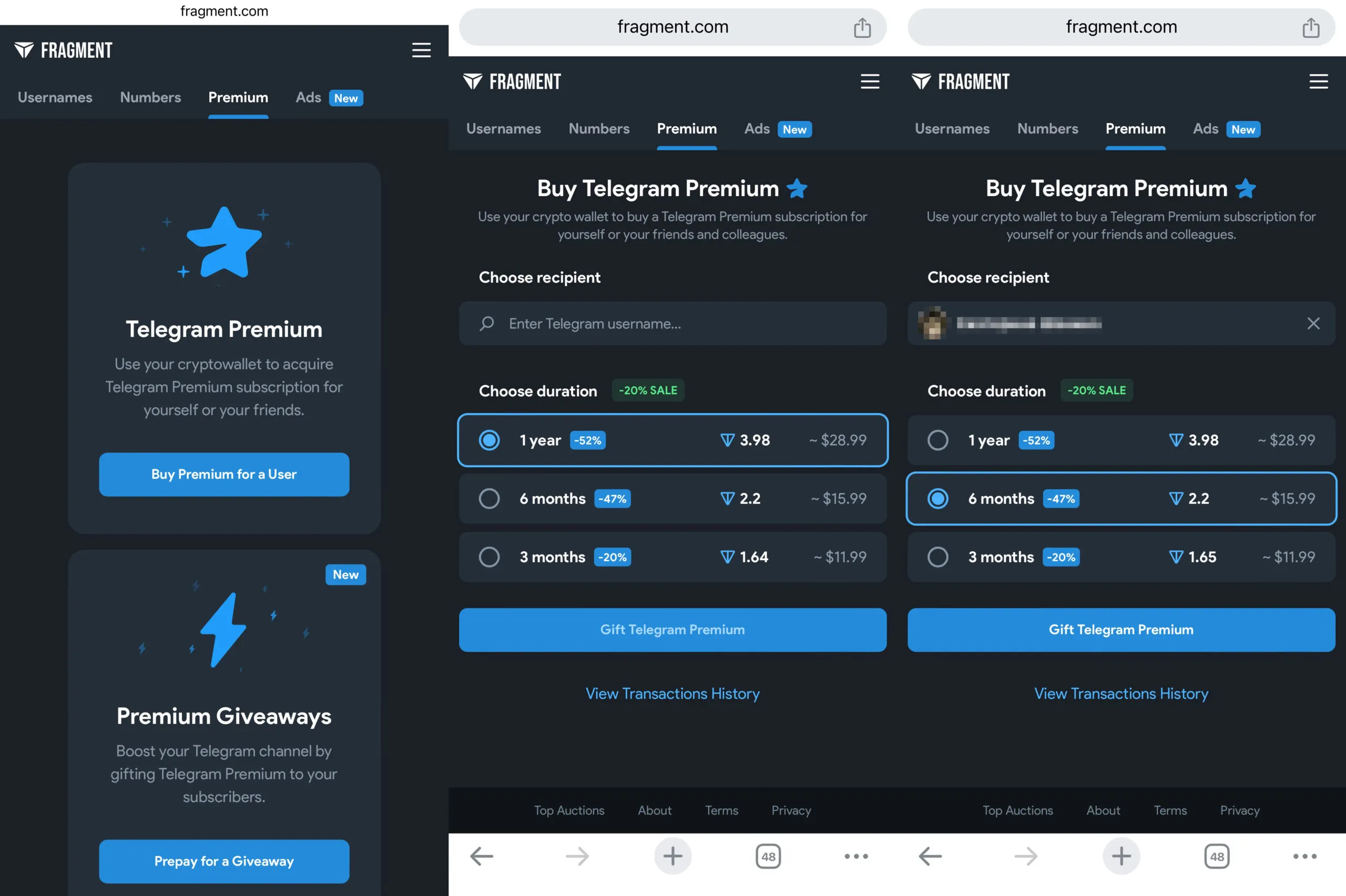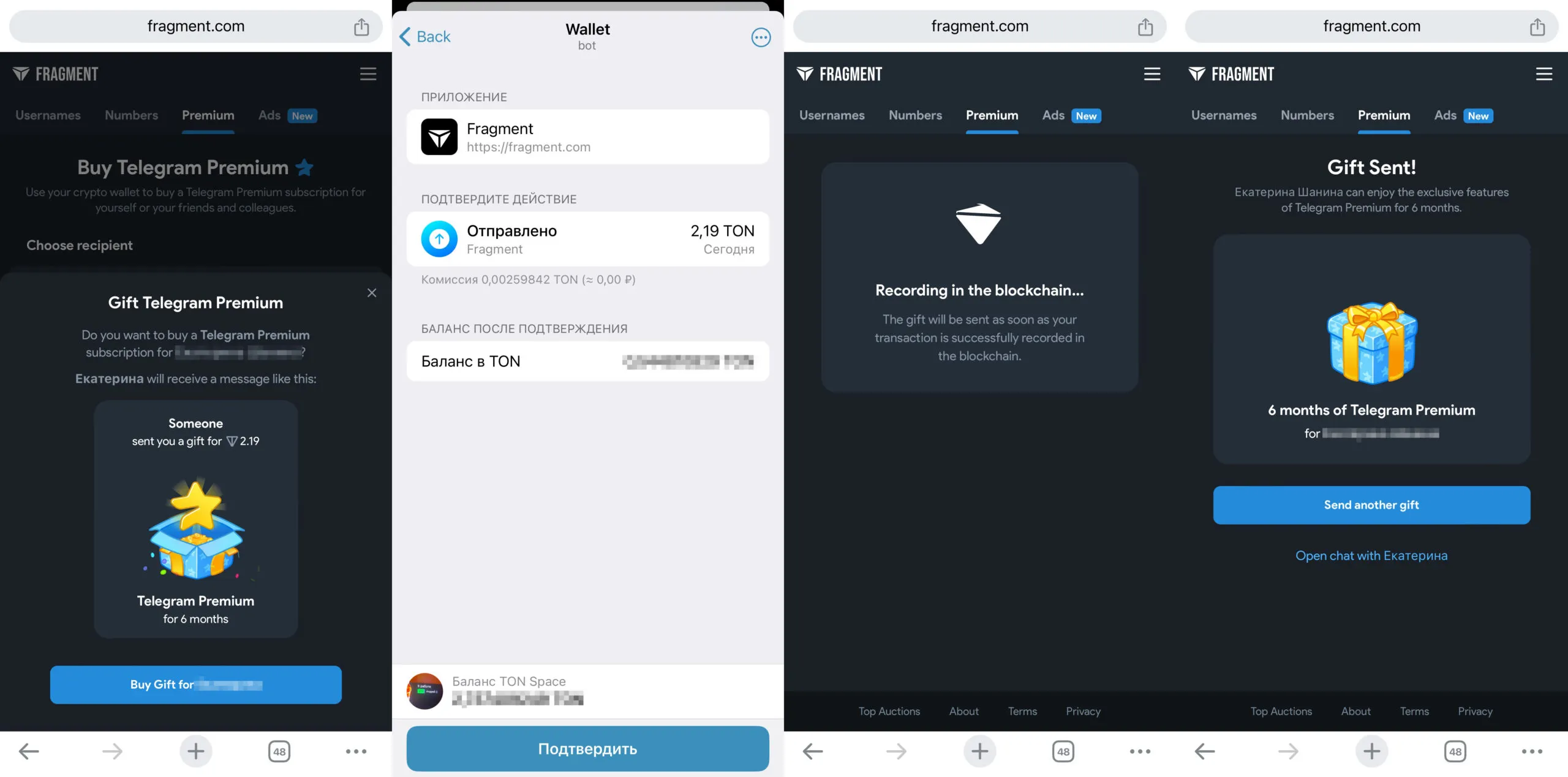 - Затем Fragment запишет транзакцию в блокчейн и отправит подписку получателю. Если у него не было «премиума» на момент оформления, то Premium активируется автоматически. Если подписка была, то купленный с помощью TON «премиум» начнет действовать, когда закончится актуальный.