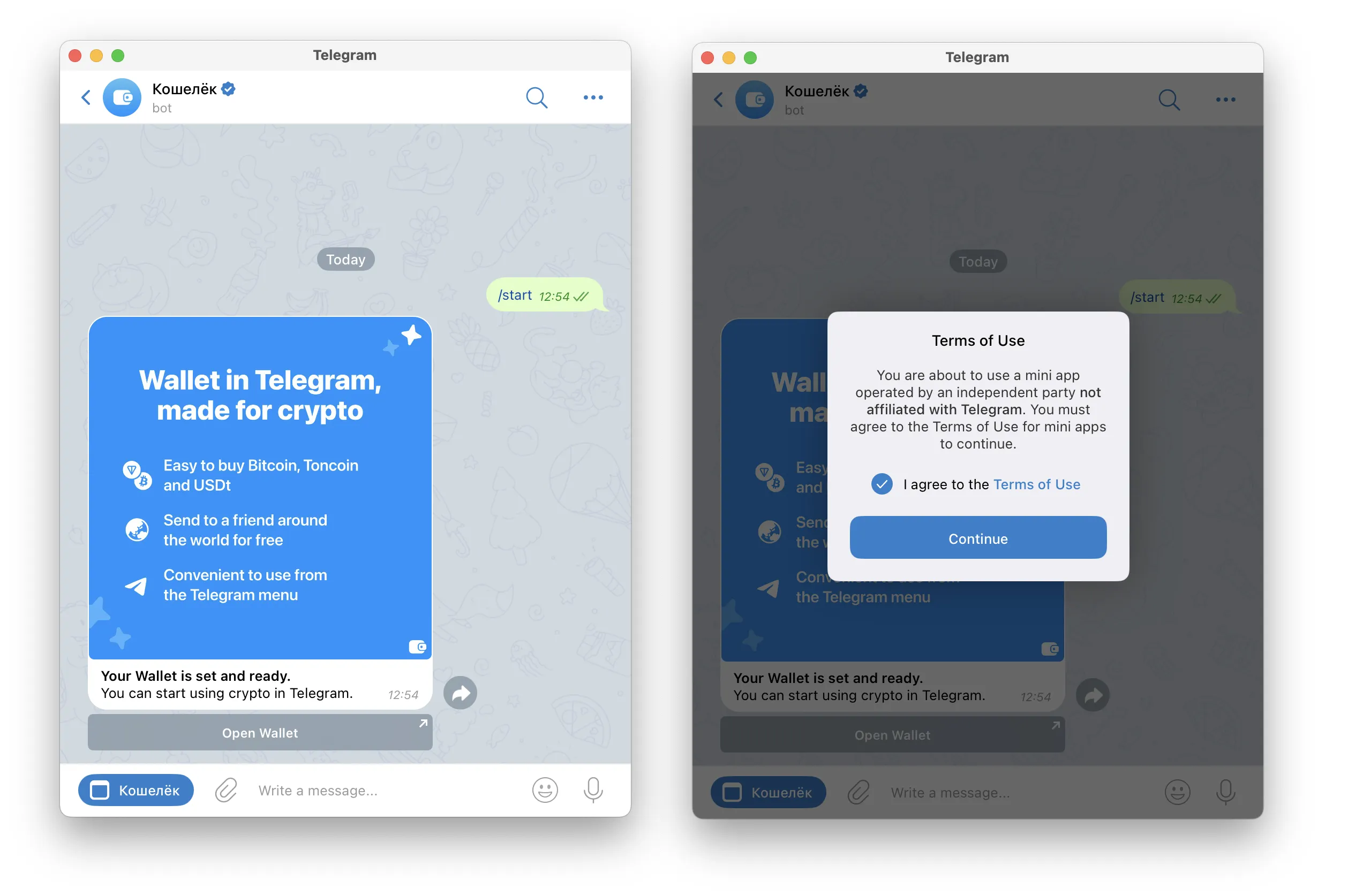 Вводим в поиске Telegram @wallet или переходим по прямой ссылке в бота. Вводим команду /start, нажимаем Open Wallet. Принимаем условия обслуживания.