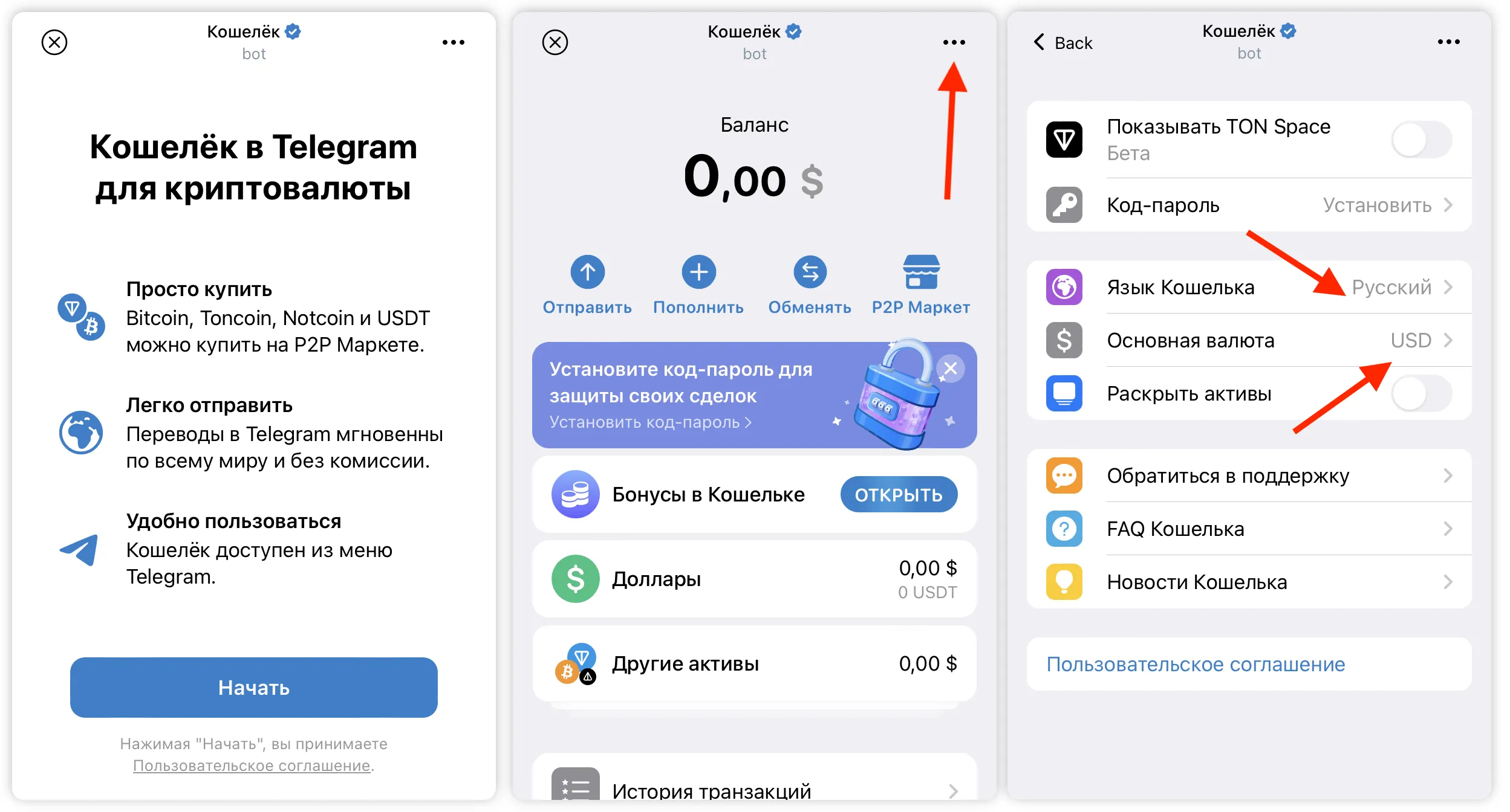 В дальнейшем перейти в Wallet можно через бота или настройки мессенджера.