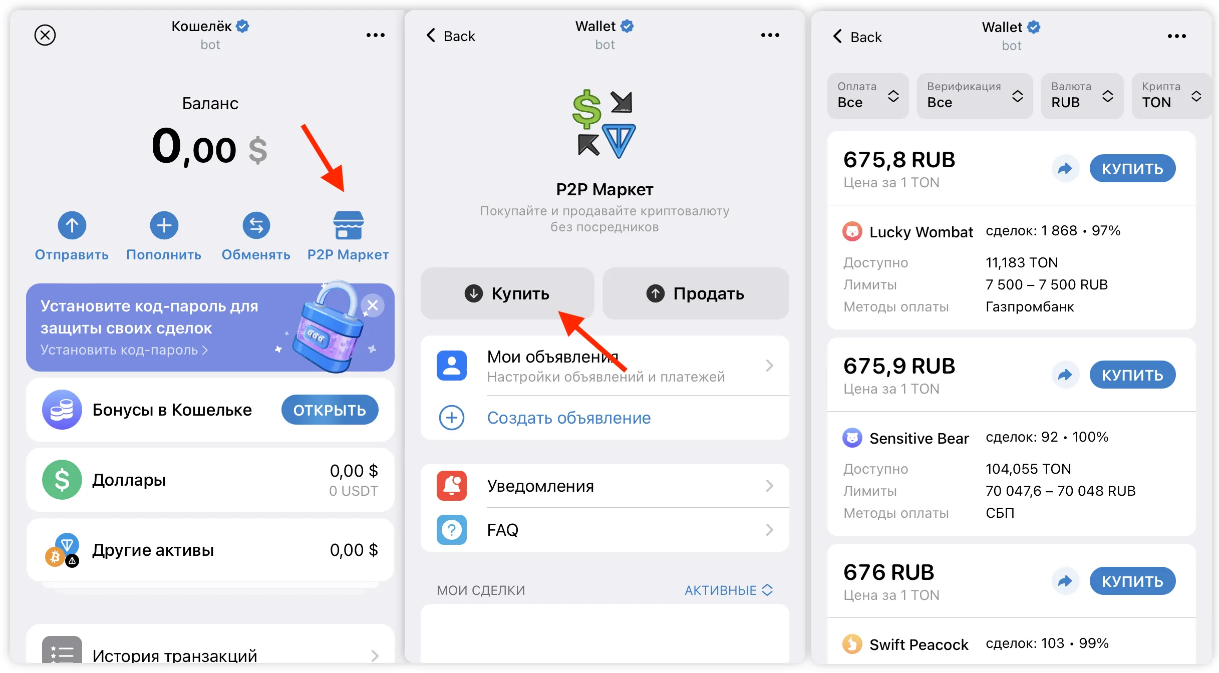 Проще всего покупать TON на P2P-рынке (peer to peer), то есть непосредственно у таких же пользователей мессенджера. Для этого выходим на главную страницу Wallet, жмем на кнопку «P2P Маркет», затем — «Купить».