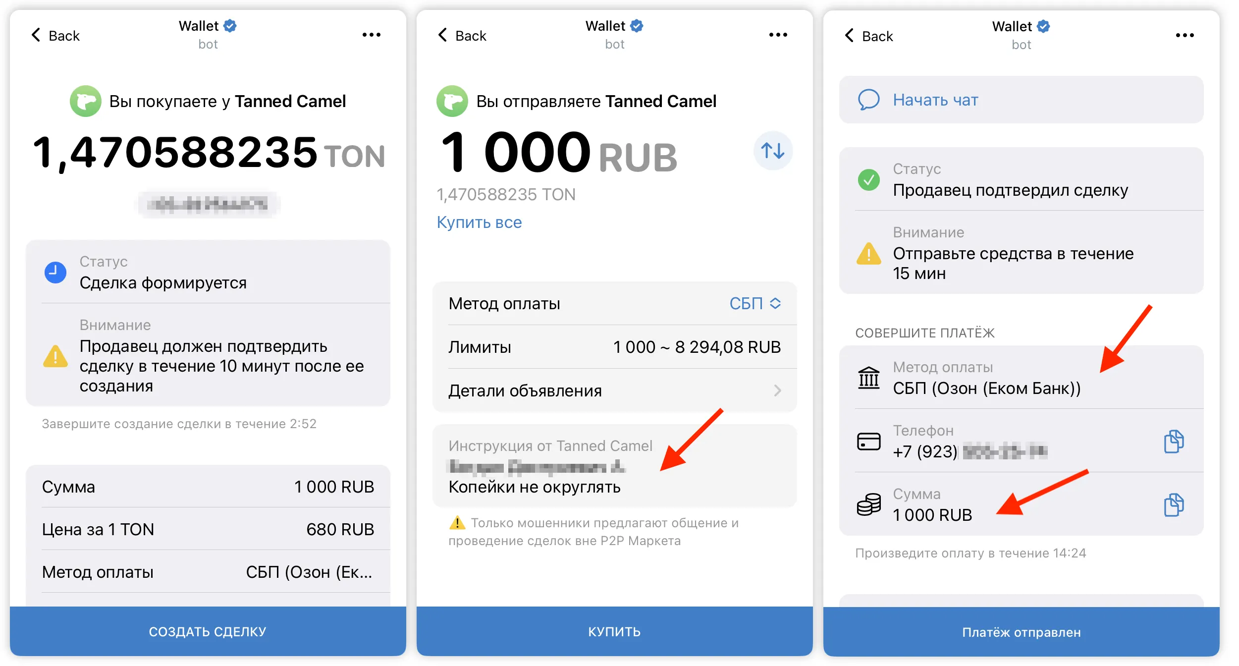 Откроется список продавцов. Предположим, нам нужно купить TON на 1000 рублей. В фильтре выбираем TON, валюта — RUB, сумма — 1000 рублей. Появится список продавцов, которые готовы продать тонкоины на сумму от одного косаря. Как правило, чем больше сумма покупки, тем выгоднее курс. Также обратите внимание, каким образом вы будете переводить деньги продавцу — чаще всего это либо перевод на карту банка, либо по СБП.
