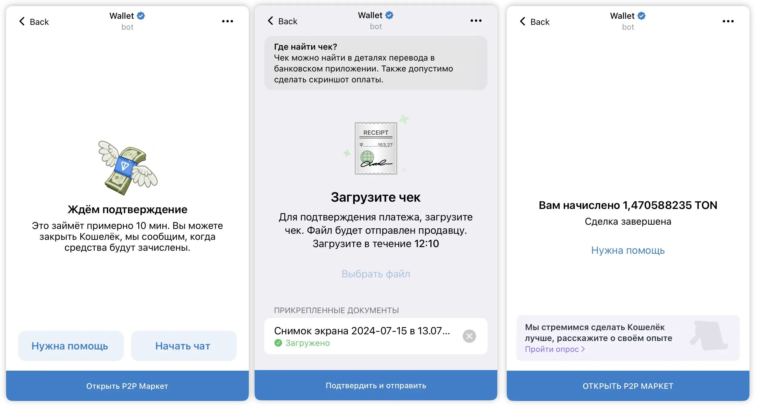 Далее нужно будет дождаться подтверждения продавца и загрузить чек транзакции. Его можно достать в приложении банка. После этого продавец проверит входящий перевод и перечислит вам деньги. Вся процедура занимает не более 15 минут, обычно — гораздо меньше. Если возникнут проблемы, жмите «Нужна помощь».
