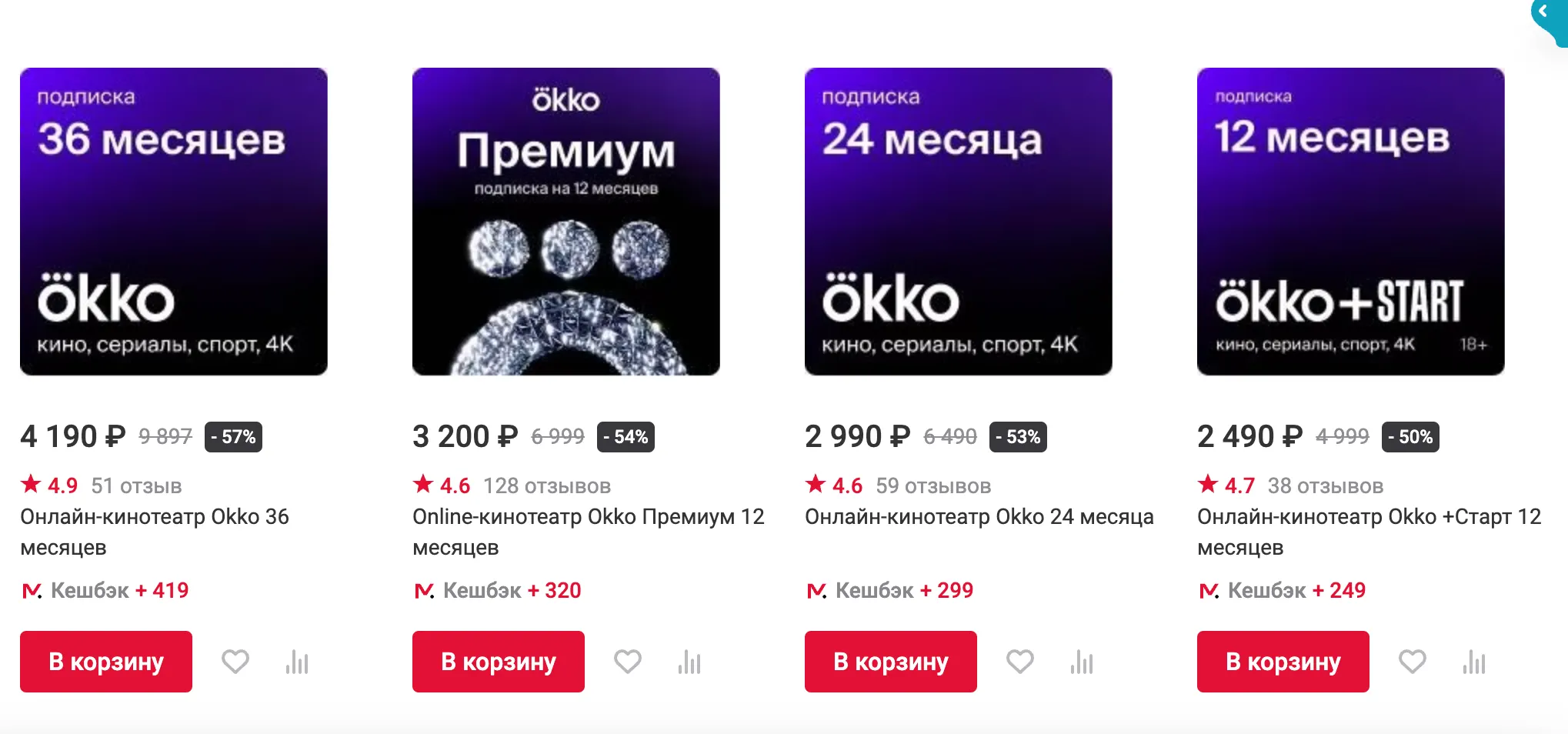 Второй способ позволяет сэкономить. Сертификаты подписок на Okko можно купить практически в любом магазине электроники. Например, в «М.Видео» подписка на 12 месяцев стоит 2490 рублей, 24 месяца (два года) — 2990 рублей, 36 месяцев (три года) — 4190 рублей.