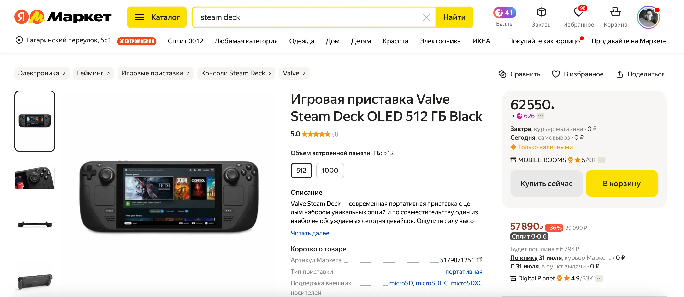- Valve Steam Deck OLED 512 Гбайт — 62 500 рублей