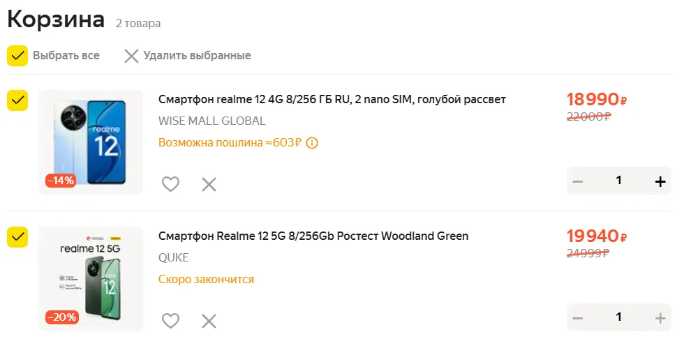 Сколько стоят аппараты? Официальные ценники дикие: 22 и 23 тысячи за Realme 12 4G и 12 5G соответственно. Открываем Маркет и видим более выгодные прайсы: 18 990 и 19 940 рублей.