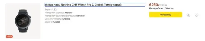 Прямо сейчас на Яндекс Маркете свежие CMF Watch Pro 2 можно заказать за 6250 рублей. Продавцы обещают доставить часики после 30 июля — на эти даты запланирован глобальный старт продаж. Для сравнения в Европе за них просят 70 евро (~7 косарей), и это без учёта налогов, доставки и прочих расходов.