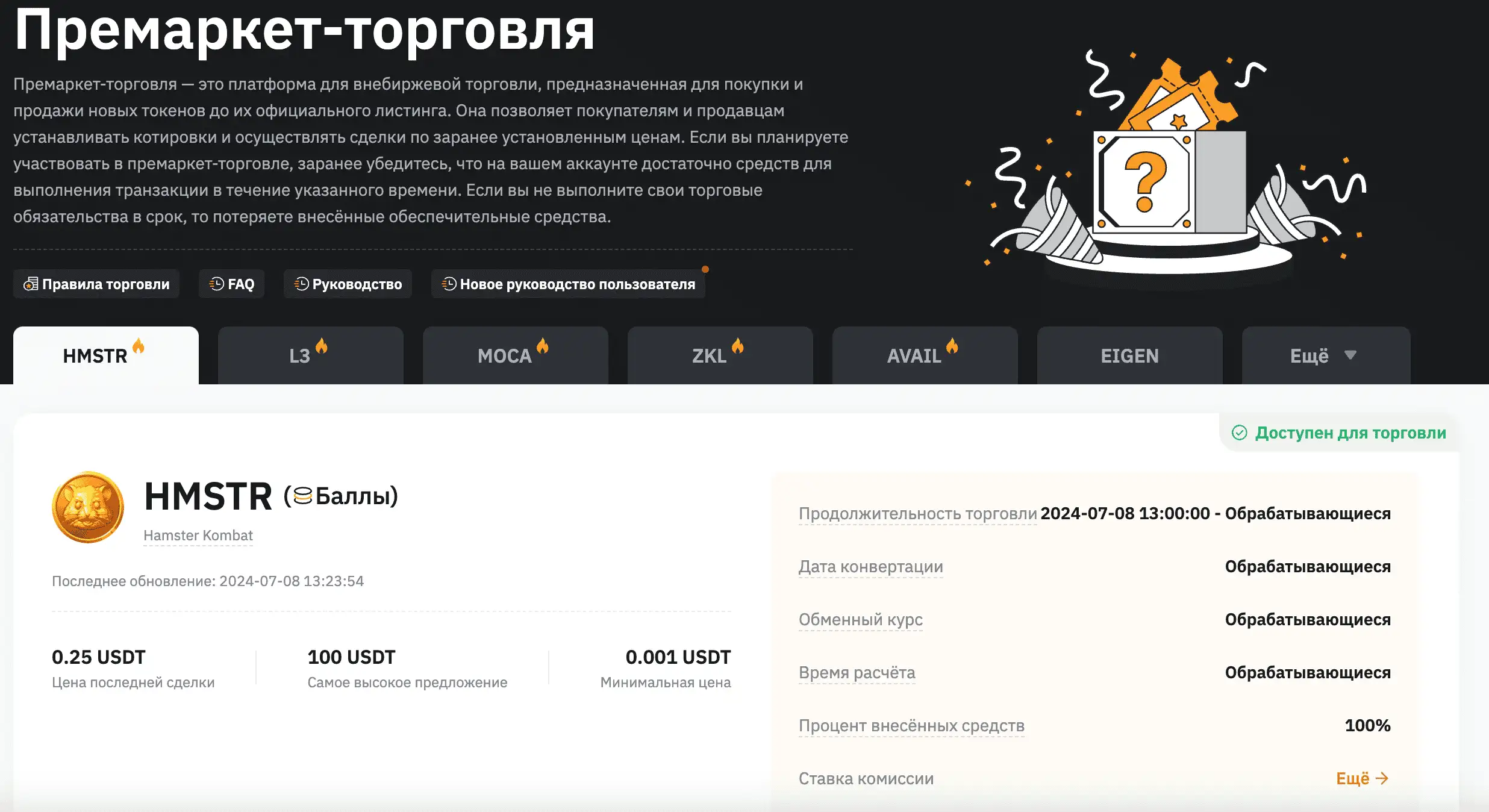 Премаркет открывает возможность торговать токенами HMSTR до официального листинга монеты. Процедура стартовала 8 июля 2024 года в 10:00 UTC.