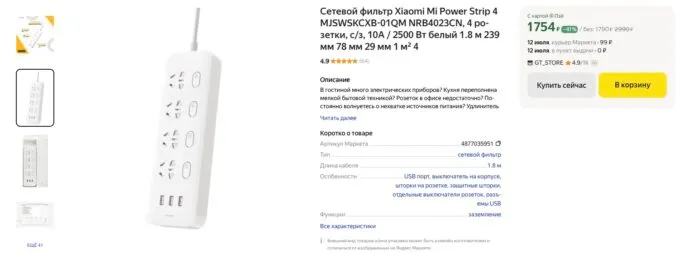 Обычно за такие фильтры просят под 3 косаря, но прямо сейчас Xiaomi Mi Power Strip (MJSWSKCXB-01QM) можно урвать на Яндекс Маркете всего за 1790 рублей. Также не забывайте про кэшбеки, которые некоторые банки отсыпают за покупки на этой платформе.