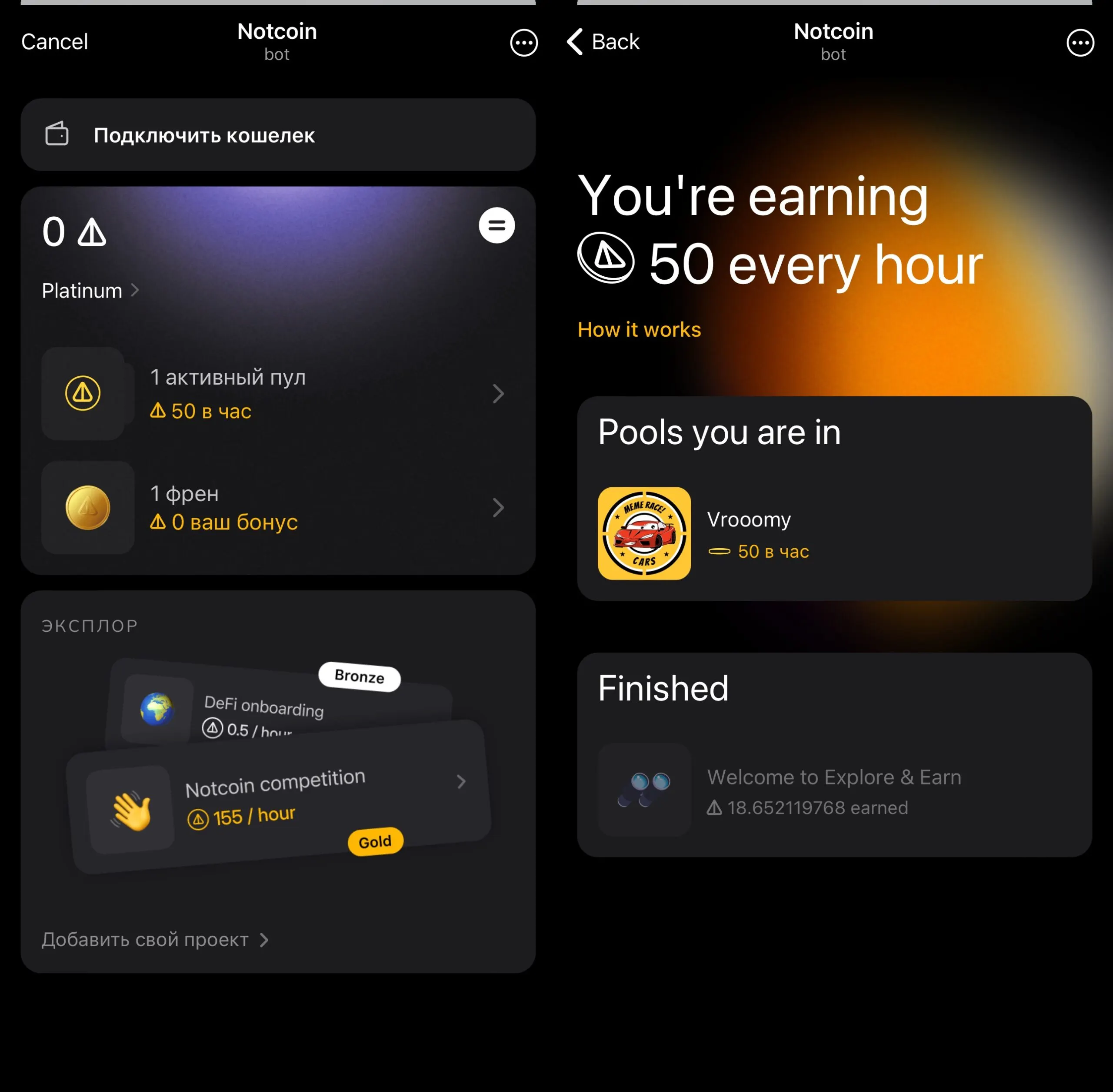 Еще весной, после аирдропа — раздачи монет игрокам — в мини-приложение добавили возможность майнить монетки NOT. То есть криптовалюту, которую можно обменять на реальные деньги. Пользователи могли запустить пул, то есть выполнить определенные условия спонсора (подписаться на канал, запустить игру, перейти на сайт и прочее) и пассивно майнить токены. Но к началу лета все пулы исчезли.