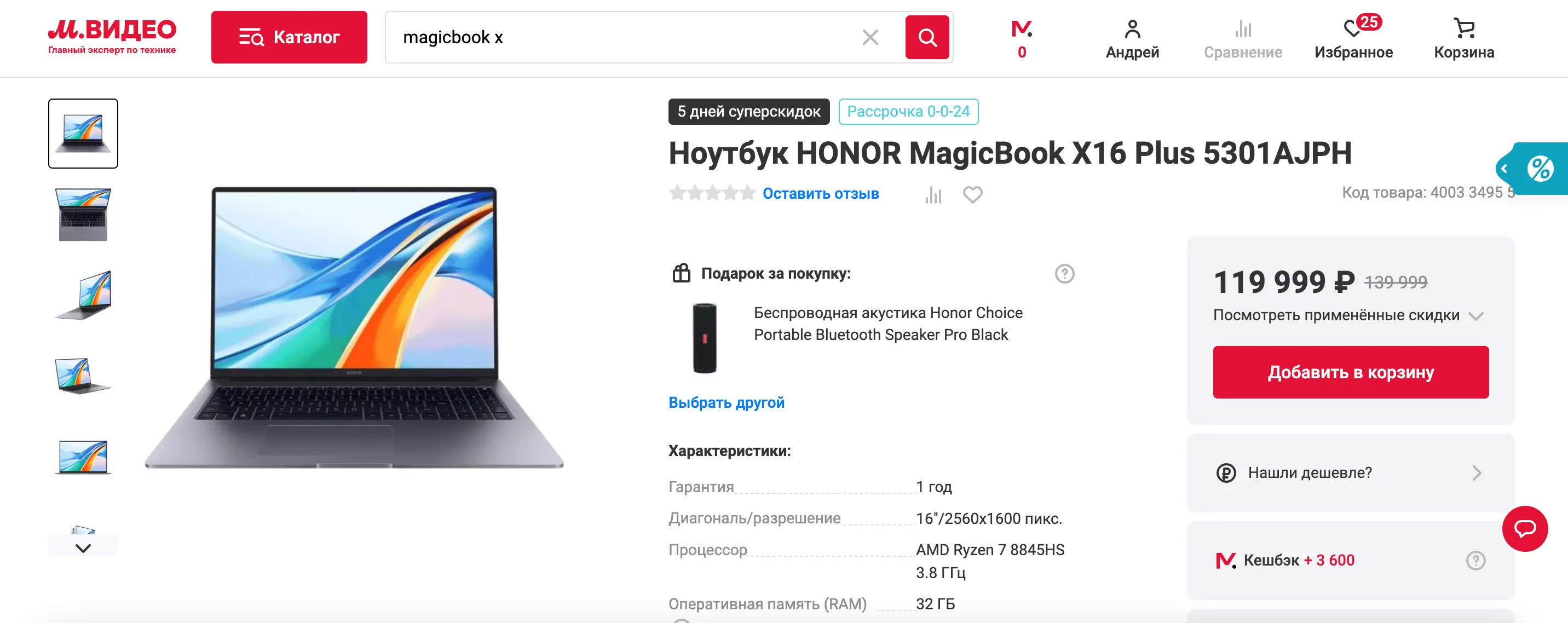 MagicBook X16 Plus доступен в трех вариантах: 16/521 Гбайт — 110 тысяч рублей, 16 Гбайт / 1 Тбайт — 120 тысяч рублей, 32 Гбайт / 1 Тбайт — 130 тысяч рублей. При покупке до 26 августа также можно рассчитывать на колонку Honor Choice Portable Bluetooth Speaker Pro в подарок и скидку 20 тысяч рублей.