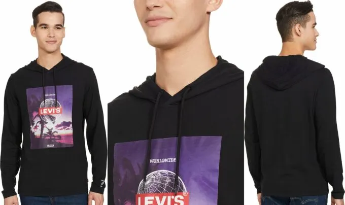 Нужны примеры? Вот они. Мы составили подборку из трех оригинальных вещей от Levi’s: футболки, худи и свитшота. Каждый из этих айтемов сейчас стоит дешевле 4500 рублей. Смотрим!