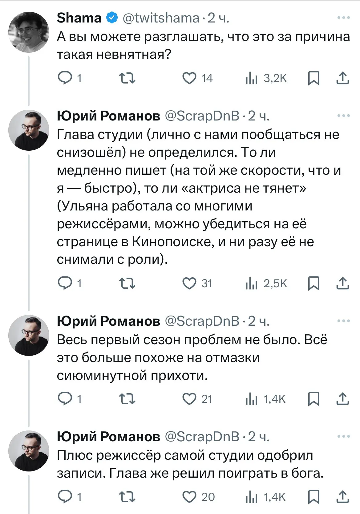 Актер дубляжа Юрий Романов, в том числе озвучивающий Дейемона Таргариена в сериале «Дом Дракона», объявил об уходе из проекта. Причиной специалист назвал «сиюминутную прихоть» руководителей студии «Кравец-рекордз», которые ранее отцепили его жену Ульяну от этого же сериала.