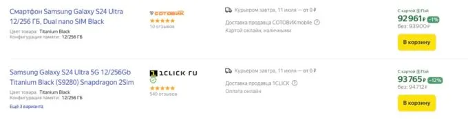 Теперь к главному — сейчас на Яндекс Маркете лучший Android-флагман 2024 года Samsung Galaxy S24 Ultra можно урвать за 93 900 рублей, а с кэшбеками банков он обойдётся в ~90 косарей.