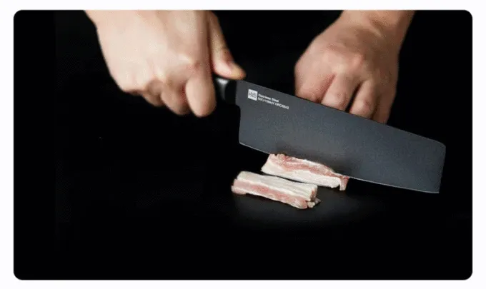 Все изделия в этом наборе сделаны из нержавеющей стали со специальной обработкой. Xiaomi заявляет, что острота и долговечность клинков обеспечена сплавом из хром-молибден-ванадиевой стали 50Cr15MoV, которая отшлифована под углом 13°. Такими ножами можно нарезать мясо, хлеб, овощи и фрукты миллиметровыми полупрозрачными слайсами, прямо как в кино или рекламе.