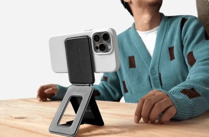 С виду Moft Snap Phone Tripod похож на фирменный картхолдер Apple, который крепится к спинке iPhone 12 и новее с помощью магнитов. Но если в Купертино отказались от фирменной кожи в пользу дешманской замши, то Moft продолжает радовать экокожей премиум-класса. Причём компания гарантирует устойчивость к стиранию, царапинам и пятнам.