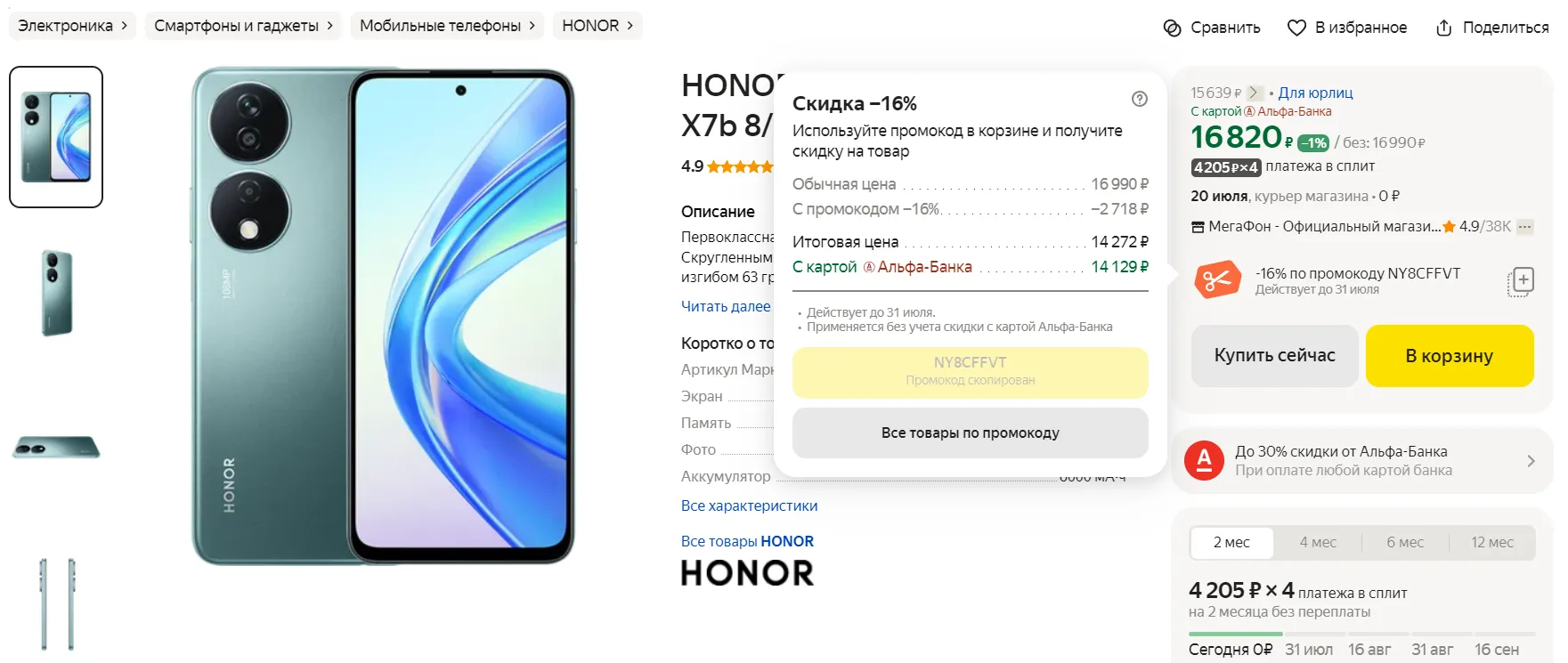 Обычно за девайс просят 15-16 кэсов, но сейчас есть возможность урвать X7b всего за 14 270 рублей. Как? Нужно нырнуть на Маркет, выбрать лот от продавца «Мегафон» и оформить заказ с промокодом NY8CFFVT. А при оплате фирменной картой «Пэй» или любой картой «Альфы» сэкономите еще пару сотен. Дерзайте!