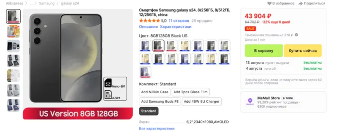 И речь идёт не только о девайсах от китайских брендов. Например, мы заметили, что на распродаже можно заказать топовый Samsung Galaxy S24 за 43 986 рублей. Так дёшево этот актуальный флагман ещё не стоил. Для сравнения, в российских магазинах устройство можно взять в лучшем случае за 55 тысяч рублей.