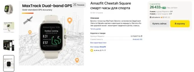 Обычно за Amazfit Cheetah Square просят больше 30 косарей, но сейчас на Яндекс Маркете эти часы сливают всего за 26 700 рублей. Также не забывайте, что многие банки готовы отсыпать щедрый кэшбек за покупки на этой платформе.