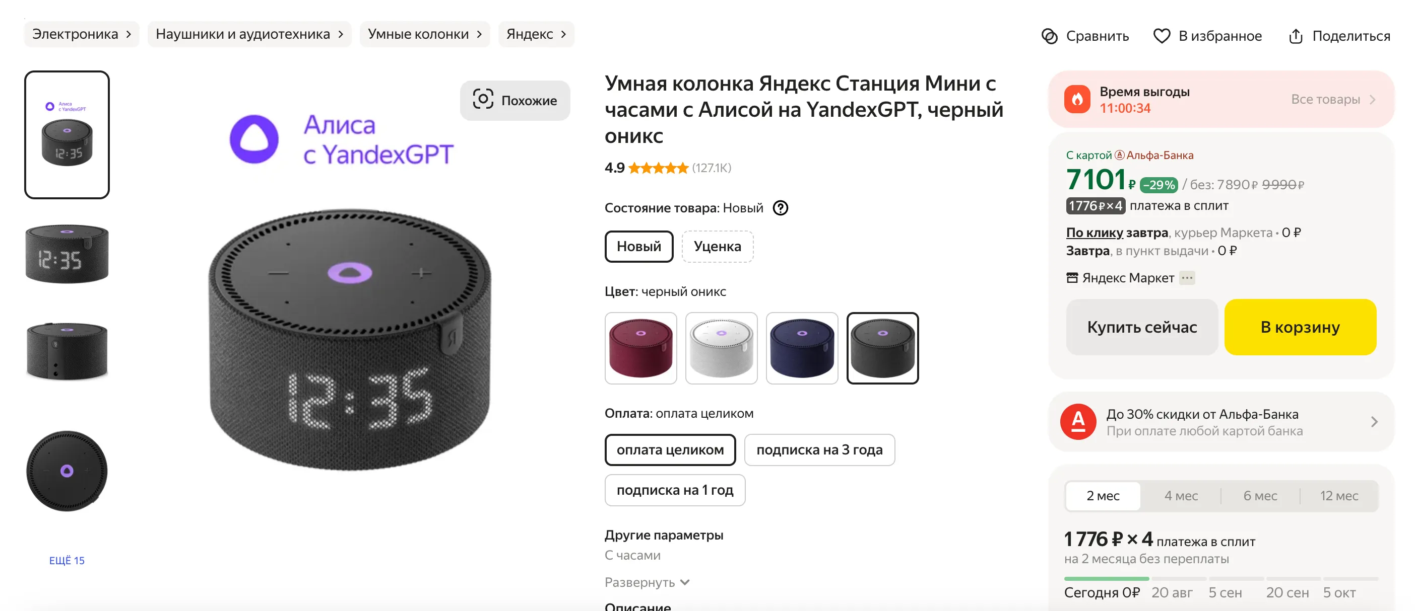 - «Яндекс Станция Мини» с часами — 7100 рублей , прошлый месяц — 9900 рублей